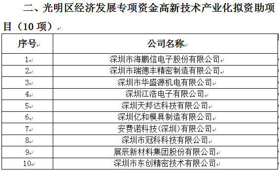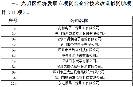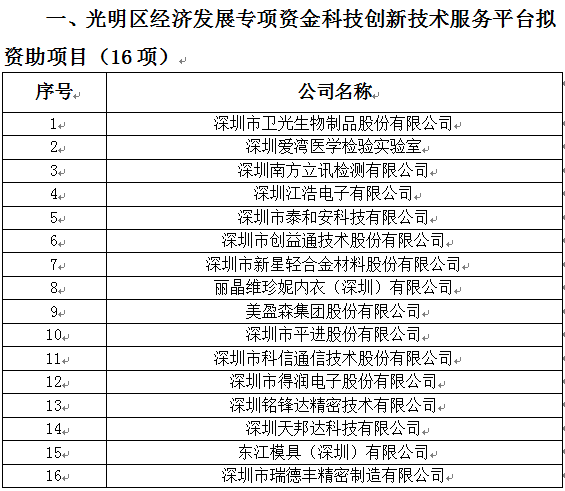 根據(jù)《深圳市光明新區(qū)經(jīng)濟(jì)發(fā)展專項(xiàng)資金管理辦法及配套實(shí)施細(xì)則》規(guī)定,經(jīng)研究,現(xiàn)將深圳市光明區(qū)經(jīng)濟(jì)發(fā)展專項(xiàng)資金擬資助項(xiàng)目——科技創(chuàng)新技術(shù)服務(wù)平臺(tái)、高新技術(shù)產(chǎn)業(yè)化、企業(yè)技術(shù)改造資助項(xiàng)目37項(xiàng)在深圳市光明區(qū)政府在線(網(wǎng)址http://www.szgm.gov.cn)予以公示,公示時(shí)間為2018年12月12日至12月18日,現(xiàn)向社會(huì)廣泛征求意見(jiàn)。