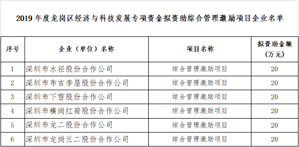 現(xiàn)將2019年度龍崗區(qū)經(jīng)濟(jì)與科技發(fā)展專項(xiàng)資金擬資助綜合管理激勵(lì)項(xiàng)目社區(qū)股份合作公司名單在龍崗區(qū)政府在線公示,向社會(huì)各界廣泛征求意見。