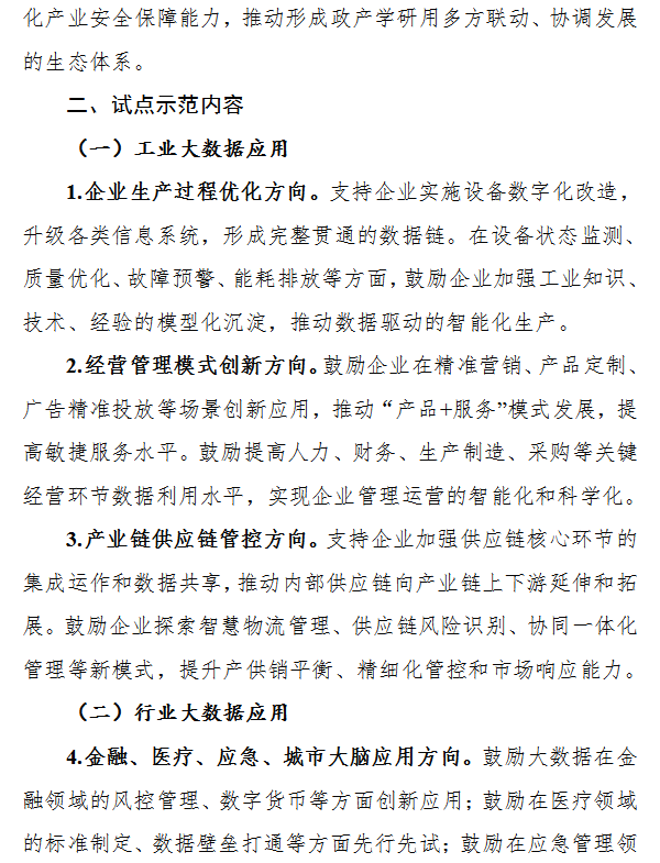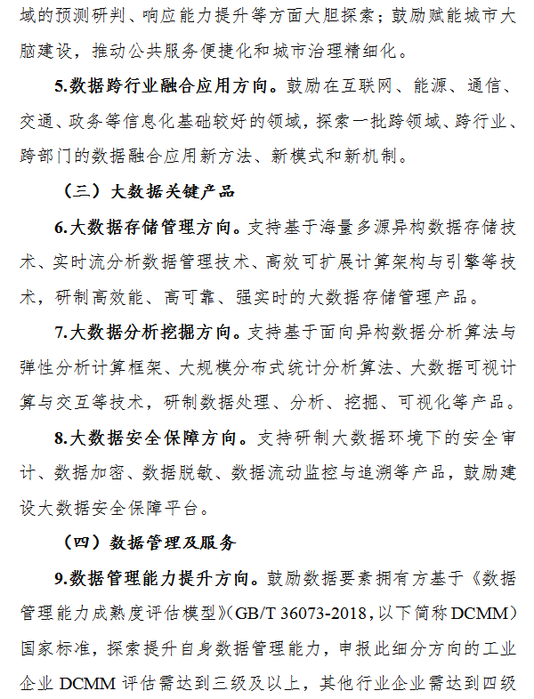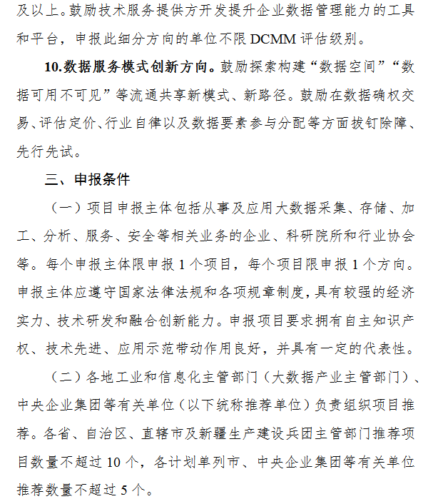 本次申報圍繞工業(yè)大數(shù)據(jù)應(yīng)用、行業(yè)大數(shù)據(jù)應(yīng)用、大數(shù)據(jù)重點產(chǎn)品、數(shù)據(jù)管理及服務(wù)四個方向,征集并遴選一批大數(shù)據(jù)產(chǎn)業(yè)試點示范項目,通過試點先行、示范引領(lǐng),總結(jié)推廣可復(fù)制的經(jīng)驗做法,推進大數(shù)據(jù)產(chǎn)業(yè)高質(zhì)量發(fā)展。申報指南詳見附件。