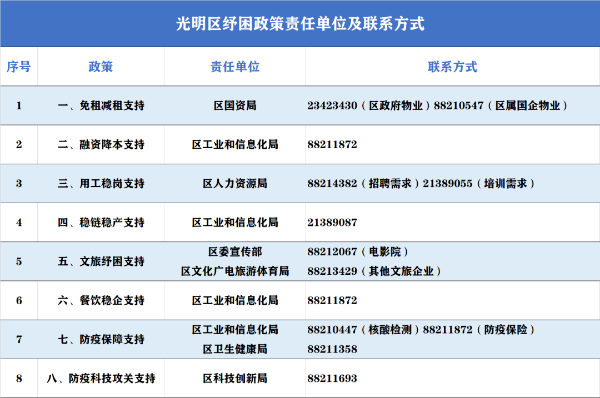為深入貫徹落實國家、省、市決策部署和《深圳市關(guān)于應(yīng)對新冠肺炎疫情進(jìn)一步幫助市場主體紓困解難若干措施》,統(tǒng)籌做好疫情防控和經(jīng)濟(jì)社會發(fā)展,支持市場主體積極應(yīng)對疫情,進(jìn)一步幫助市場主體紓困解難,結(jié)合光明區(qū)實際,制定本補充措施。 一、免租減租支持 1.制造業(yè)小微企業(yè)、服務(wù)業(yè)小微企業(yè)和個體工商戶承租區(qū)政府以及區(qū)屬獨資、全資、絕對控股國有企業(yè)的房屋,免除3個月租金、再減半收取3個月租金。(責(zé)任單位:區(qū)國資局、區(qū)科技創(chuàng)新局、區(qū)住房建設(shè)局、區(qū)文化廣電旅游體育局、區(qū)教育局、各街道) 二、融資降本支持 2.對轄區(qū)中小微企業(yè)在2022年4月1日至6月30日期間獲得的新增貸款(展期視同新增),按實際支付利息的20%給予貼息支持,貼息期限不超過6個月,單家企業(yè)最高10萬元。(責(zé)任單位:區(qū)工業(yè)和信息化局) 三、用工穩(wěn)崗支持 3.對受疫情影響招工困難的企業(yè),每月提供校企對接、招工引才對接、勞務(wù)輸出地招聘、線上招聘、校園招聘等服務(wù);對有培訓(xùn)需求的企業(yè),提供“送培訓(xùn)進(jìn)企業(yè)”“云課程”等訂單式公益培訓(xùn)。(責(zé)任單位:區(qū)人力資源局) 四、穩(wěn)鏈穩(wěn)產(chǎn)支持 4.依托光明區(qū)企業(yè)服務(wù)門戶建立企業(yè)紓困訴求快速響應(yīng)機制,多部門聯(lián)動協(xié)調(diào)解決企業(yè)供應(yīng)鏈堵點問題,保障重點企業(yè)產(chǎn)業(yè)鏈、供應(yīng)鏈暢通運轉(zhuǎn)。(責(zé)任單位:區(qū)工業(yè)和信息化局) 5.對轄區(qū)大型工業(yè)企業(yè)積極擴(kuò)大對轄區(qū)中小微工業(yè)企業(yè)采購規(guī)模的,按照其2022年4月1日至6月30日期間采購金額同比新增部分給予一定獎勵,單家企業(yè)最高50萬元。(責(zé)任單位:區(qū)工業(yè)和信息化局) 6.對在政策有效期內(nèi)新納入全國大型制造業(yè)企業(yè)供應(yīng)鏈體系的中小微企業(yè),按照其在2022年4月1日至6月30日期間向全國大型制造業(yè)企業(yè)供貨金額予以一定獎勵,單家企業(yè)最高50萬元。(責(zé)任單位:區(qū)工業(yè)和信息化局) 五、文旅紓困支持 7.對主動配合疫情防控、在條件具備時恢復(fù)經(jīng)營的景點景區(qū)、旅行社,按照其在2022年4月1日至6月30日期間營業(yè)額予以一定支持,最高20萬元。(責(zé)任單位:區(qū)文化廣電旅游體育局) 8.對主動配合疫情防控、在條件具備時恢復(fù)經(jīng)營的電影院、劇院等文化經(jīng)營場所,按照其2022年4月1日至6月30日期間實際支付租金總額的20%給予支持,最高20萬元(已享受第一條免租減租政策的除外)。(責(zé)任單位:區(qū)委宣傳部、區(qū)文化廣電旅游體育局) 六、餐飲穩(wěn)企支持 9.對主動配合疫情防控、在條件具備時恢復(fù)經(jīng)營的限上餐飲企業(yè),按照其在2022年4月1日至6月30日期間營業(yè)額予以一定補貼,單家企業(yè)最高20萬元。(責(zé)任單位:區(qū)工業(yè)和信息化局) 七、防疫保障支持 10.對從業(yè)人員超過500人的企業(yè),定期提供上門免費核酸檢測服務(wù);對其它中小微企業(yè),就近提供便利免費核酸檢測服務(wù)。(責(zé)任單位:區(qū)工業(yè)和信息化局、區(qū)衛(wèi)生健康局) 11.支持企業(yè)購買防疫保險,增強應(yīng)對疫情風(fēng)險能力,對2022年4月1日至6月30日期間購買防疫保險產(chǎn)品的企業(yè),按照其實際支付保費的50%予以支持,單家企業(yè)最高5萬元。(責(zé)任單位:區(qū)工業(yè)和信息化局) 八、防疫科技攻關(guān)支持 12.對在新冠藥物、檢測試劑、消殺技術(shù)、臨床救治等疫情防控重點領(lǐng)域開展研發(fā)的企業(yè),其產(chǎn)品在2022年4月1日至12月31日期間獲批上市推廣使用的,每個產(chǎn)品給予最高50萬元資助,單家企業(yè)最高100萬元。(責(zé)任單位:區(qū)科技創(chuàng)新局) 本政策由光明區(qū)發(fā)展和改革局會同各責(zé)任單位負(fù)責(zé)解釋。對國家、廣東省、深圳市出臺的相關(guān)支持政策,從其要求全面貫徹落實。同類政策標(biāo)準(zhǔn)不一致的,按照從高不重復(fù)原則最大力度支持企業(yè)發(fā)展。對需要出臺申請指南和操作指引的政策,由相關(guān)責(zé)任單位另行加快制定并組織實施。本措施自發(fā)布之日起實施,除已有明確期限規(guī)定外,有效期截至2022年6月30日,申請期截至2022年7月15日。